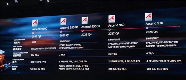 未来的Ascend 960、Ascend 970还会进一步提升容量到288GB,带宽9.6TB/s、14.4TB/s,时间点在2027到2028年。