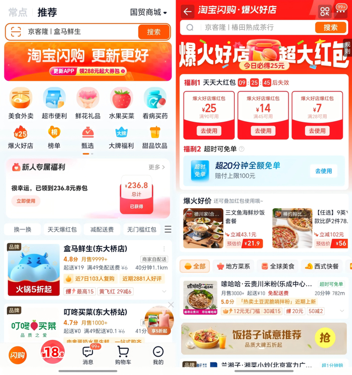 比如双11期间,淘宝闪购近期上线了“爆火好店”频道,推荐客单价较高的正餐商家,并接连上线“25元大额红包”、“超时20分钟免单”、“加速配送”等全新升级服务。这在为消费者提供优质供给和确定性服务的同时,也帮助高客单商家吸引更多高价值的用户。